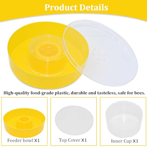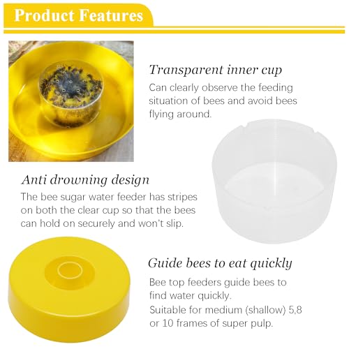 Easy to use: The bee top feeder consists of a yellow plastic base, a plastic inner cover and a plastic upper cover. The clear cup in the bee quick feeder prevents bees from flying around and allows for a clear view of the bees feeding. The beekeeping top feeder is easy to install and can be refilled without opening the hive or disturbing the bees, saving beekeepers time and effort.