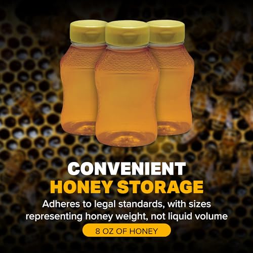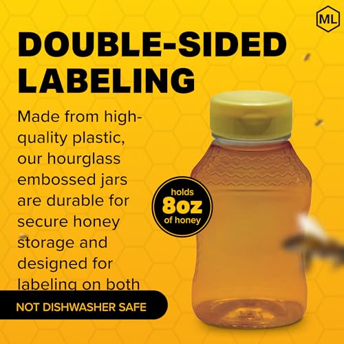 Mann Lake Hourglass Embossed Honey Jars, Plastic Honey Container, Easy Honey Dispensing, Yellow Flip-Top Lids Included, Honey Storage, 24-Pack, 8 oz