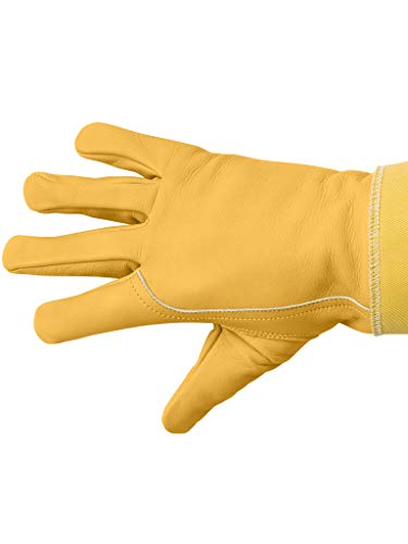 Professional beekeeper gloves with durable cow leather hands, reinforced and ventilated wrists, heavy duty canvas sleeves, and elastic cuffs